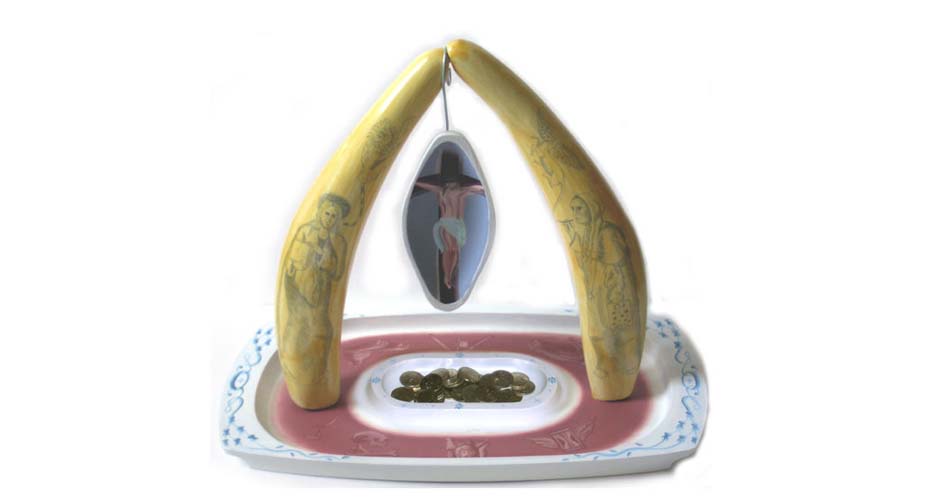 Oamaru Altar 2006 Oil on wooden objects, wire, coins and scrimshaw 380mm x 300mm x 310mm |