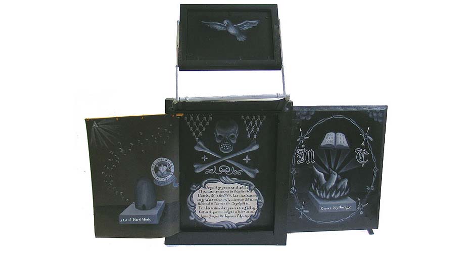 Reloj De La Recesión (políptico), (back view) 2009 Oil and acrylic on wood, metal and canvas; mirror 640mm x 585mm x 470mm (open) |