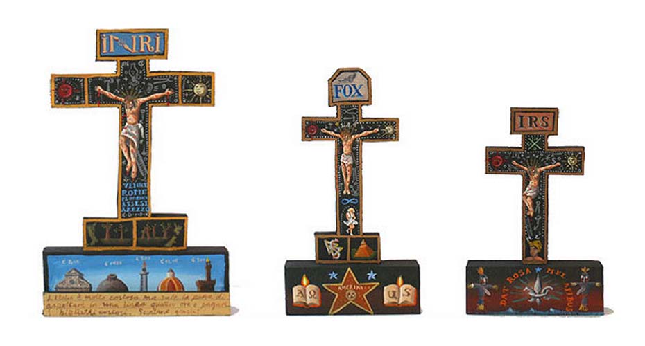 (left to right) Cross That One Off The List: Italy, Los Angeles, New Orleans all 2008 all oil and acrylic on wood 265mm x 170mm x 40mm, 230mm x 130mm x 35mm, 190mm x 130mm x 35mm |