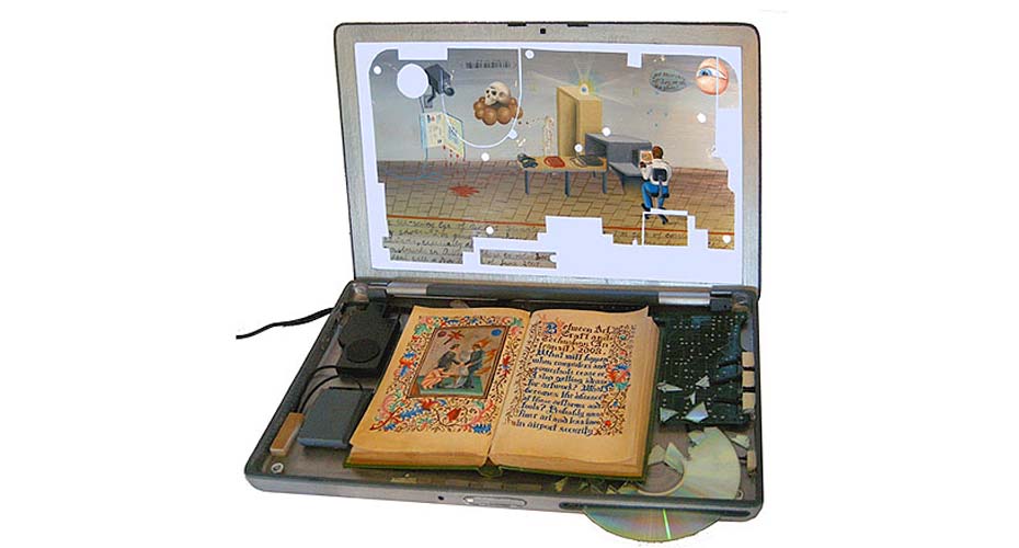 Between Art, Craft and Technology (In Transit) 2008 Oil and acrylic on wood, plastic, found book and tin; 240v illuminated panel 220mm x 370mm x 360m |